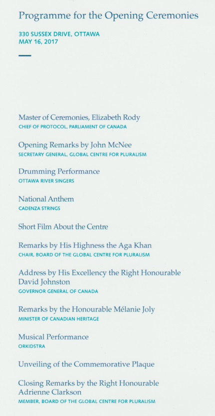 A photo of the actual program distributed to guests and members of media who attended the opening ceremony of the Global Centre for Pluralism.