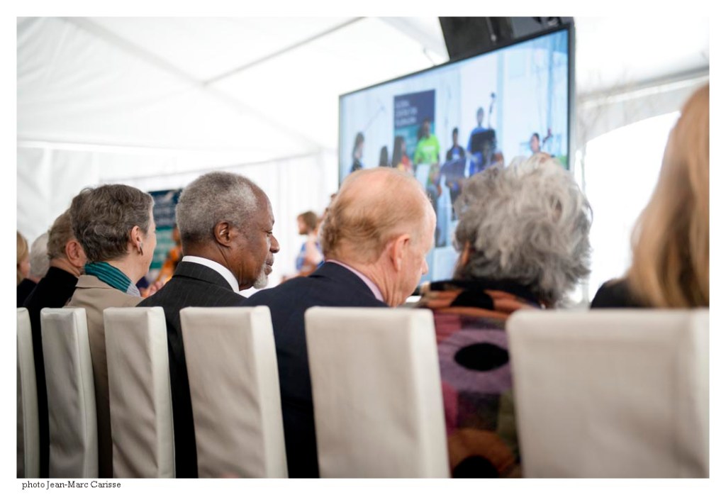 Former UN Secretary General Kofi Annan, essayist and philosopher John Ralston Saul, and his wife, the Right Honourable Adrienne Clarkson, listen to a musical performance by children from the organization Orkidstra during the opening ceremony of the Global Centre for Pluralism on Tuesday, May 16, 2017. Both Annan and Clarkson are on the Board of Directors of the Centre that is chaired by the Aga Khan. Photo: Jean-Marc Carisse. Copyright.