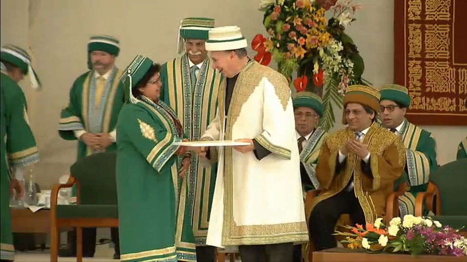 His Highness the Aga Khan presenting an Award of Excellence to Jacqueline Dias during a convocation held in East Africa in 2013 on the occasion of the Aga Khan University’s 30th year of founding. His ancestor, the Fatimid Imam-Caliph Al-Muizz was the founder of the Al-Azhar University in Cairo, a thousand years ago.