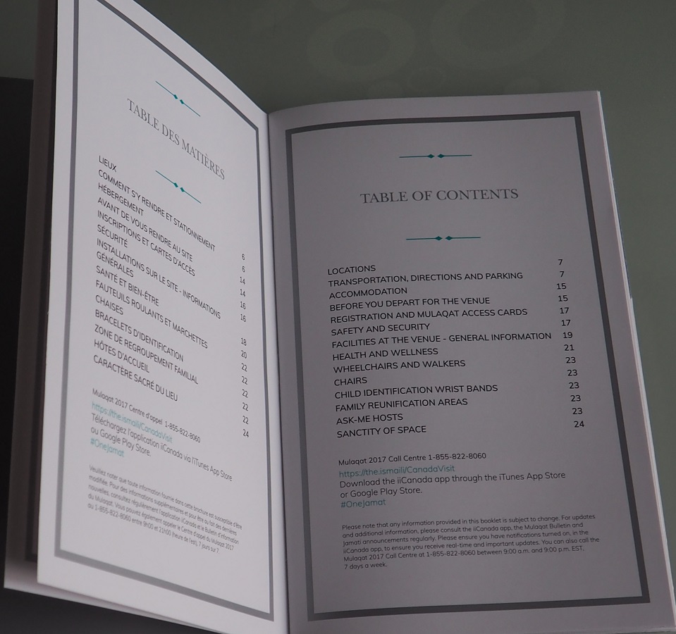 Table of contents in Mulaqat Canada 2017 information booklet produced by Ismaili institutions, one each for Montreal and Toronto mulaqats. Shown is the bilingual Montreal edition.