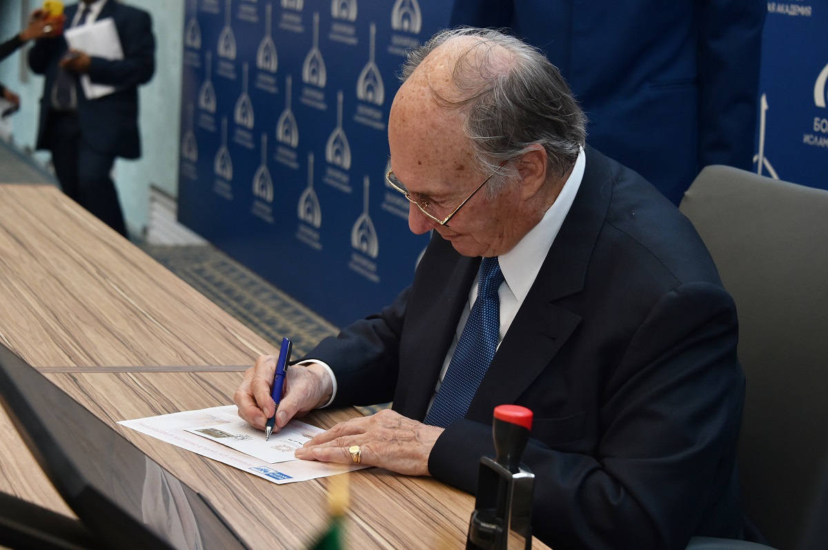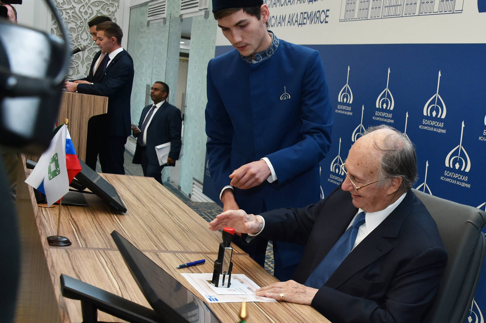 During his time in Bolgar, Hazar Imam participated in a postage stamp cancellation ceremony at the Bolgar Islamic Academy. Founded in 2016, the institute of higher education trains graduate students in a variety of fields relating to the study of theology and religion. Hazar Imam was accompanied at the ceremony by Mintimer Shaimiev, State Councellor of Tatarstan; and Daniyar Abdrakhmanov, Rector of the Bolgar Islamic Academy.