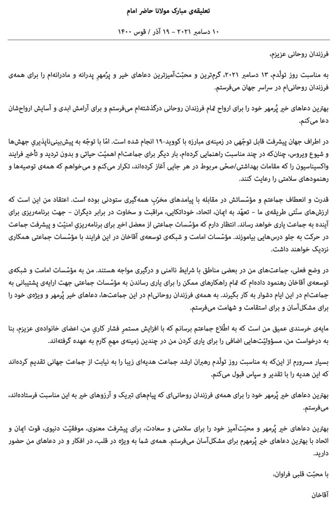 La fuerza y la resistencia que mi Jamat y sus instituciones han mostrado para hacer frente a las perjudiciales consecuencias de la pandemia han sido admirables. Estoy convencido de que los valores tradicionales de nuestra Tariqah – de compromiso con la fe, de unidad, autosuficiencia, de cuidado y generosidad hacia los demás – servirán bien al Jamat a medida que planificamos el futuro. Confío en que las instituciones del Jamat extraigan lecciones de la reciente adversidad mientras planifican la seguridad y el progreso del Jamat de cara al futuro. Las instituciones del Imamat y la AKDN trabajarán estrechamente con las instituciones del Jamat en este proceso.