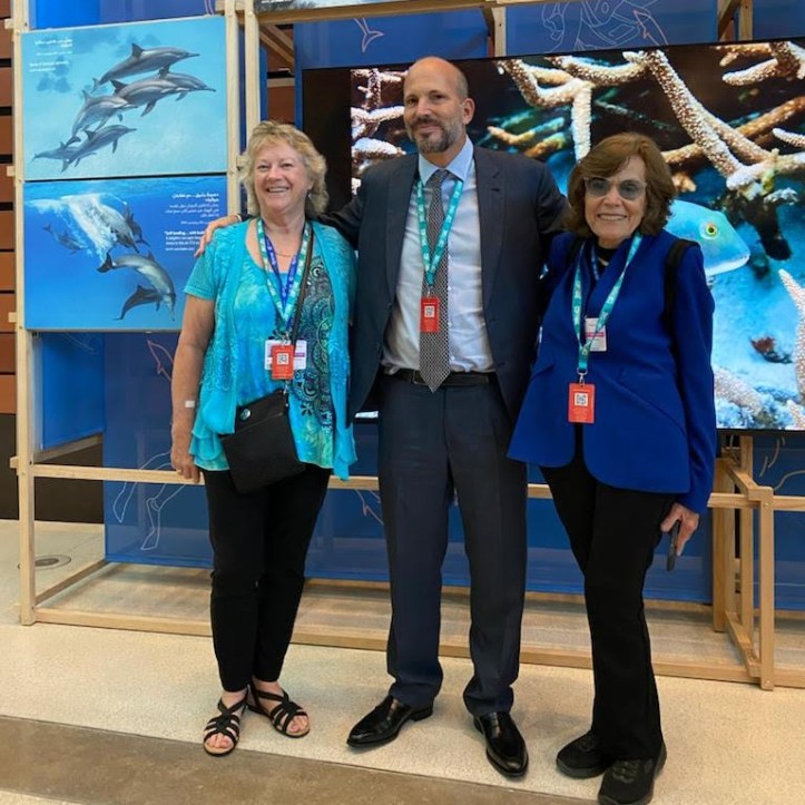 Dr. Denise Herzing (left), research director and founder of the Wild Dolphin Project (WDP) with Prince Hussain Aga Khan and Dr. Sylvia Earle, celebrated marine biologist, explorer, and author, at the UN Climate Change Conference COP28 in Dubai. Photograph: WDP Facebook Page.