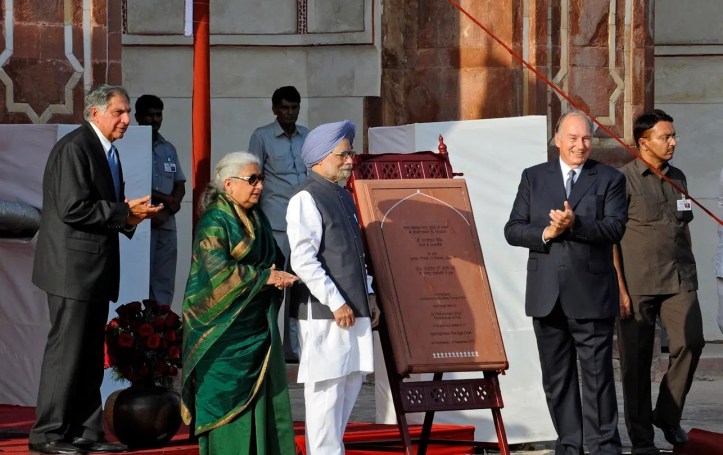 The restoration of the Mughal Emperor Humayun’s 16th century garden tomb, the jewel of Mughal architecture that predates the Taj Mahal, was inaugurated on September 18, 2013, by India’s Prime Minister, Dr Manmohan Singh, Union Minister of Culture Mrs Chandresh Kumari Katoch, Chairman of the Sir Dorabji Tata Trust, Mr Ratan Tata, and Mawlana Hazar Imam. Mr. Ratan Tata, it might be noted, passed away on October 9, 2024, at the age of 88.