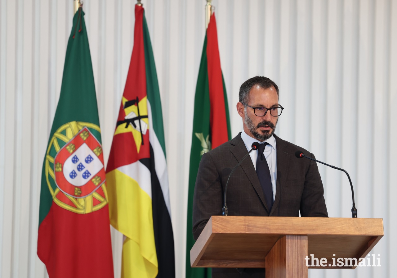 Prince Rahim Aga Khan addresses guests at the Diwan of the Ismaili Imamat in Lisbon, Portugal, on October 28, 2024, as he accepts the Mostar Peace Connection Award on behalf of his father, Mawlana Hazar Imam, His Highness the Aga Khan. Photograph: AKDN/Luis Felipe Catarino.